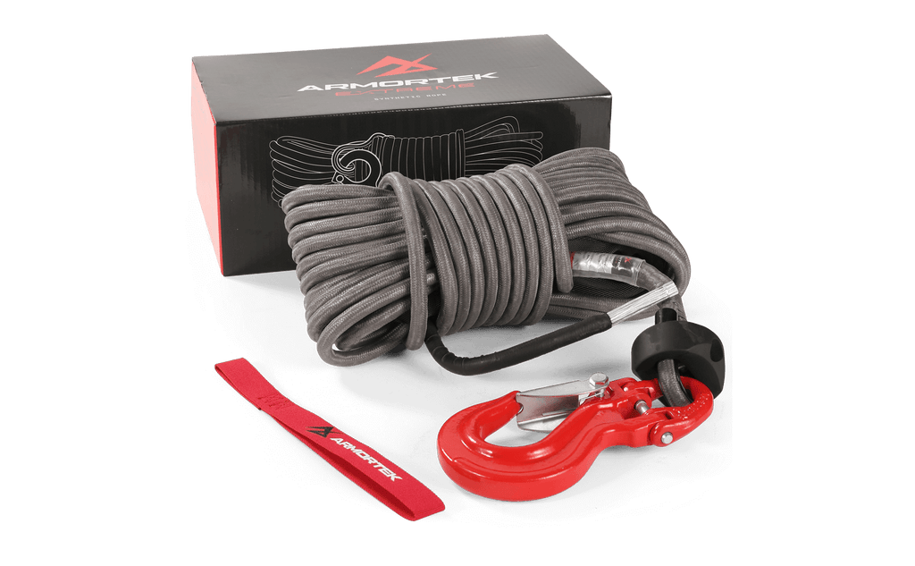 This complete winch rope kit includes a high-strength 9/16" x 65.6' (14mm x 20m) Armortek Extreme Synthetic Rope, a heavy-duty hook, a rope stopper, and a handsaver strap, giving you everything you need for safe and reliable winching.